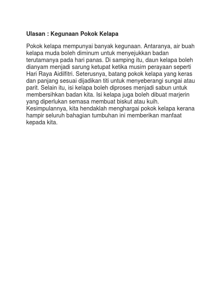 Contoh Ayat Kegunaan Pokok Kelapa 1. Daun dan lidi tempurungisi kelapa tua air kelapa. Catat Ulasan Atom Cari artikel lain.