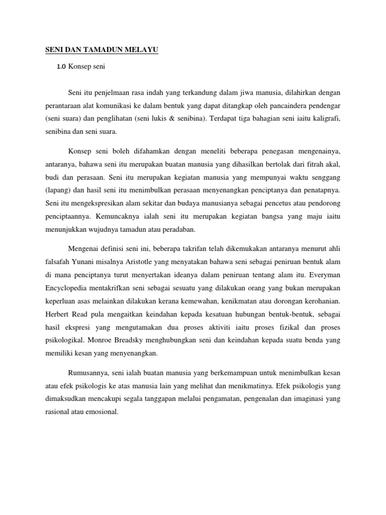 Tidak dapat dinafikan bahawa di nusantara yang kaya dengan kebudayaan menjadikan ia tempat yang sesuai dengan perkembangan seni. Hasil interaksi antara Tamadun Melayu dan Tamadun Cina di Tanah Melayu pada zaman awal amat ketara pada aspek seni bina. PENGARUH TAMADUN ISLAM DALAM ASPEK KESENIAN Seni dapat dipandang dari pelbagai segi antaranya dari segi kemahiran segi kegiatan manusia segi karya manusia dari segi seni halus fine arts dan dari segi seni pandang visual arts.